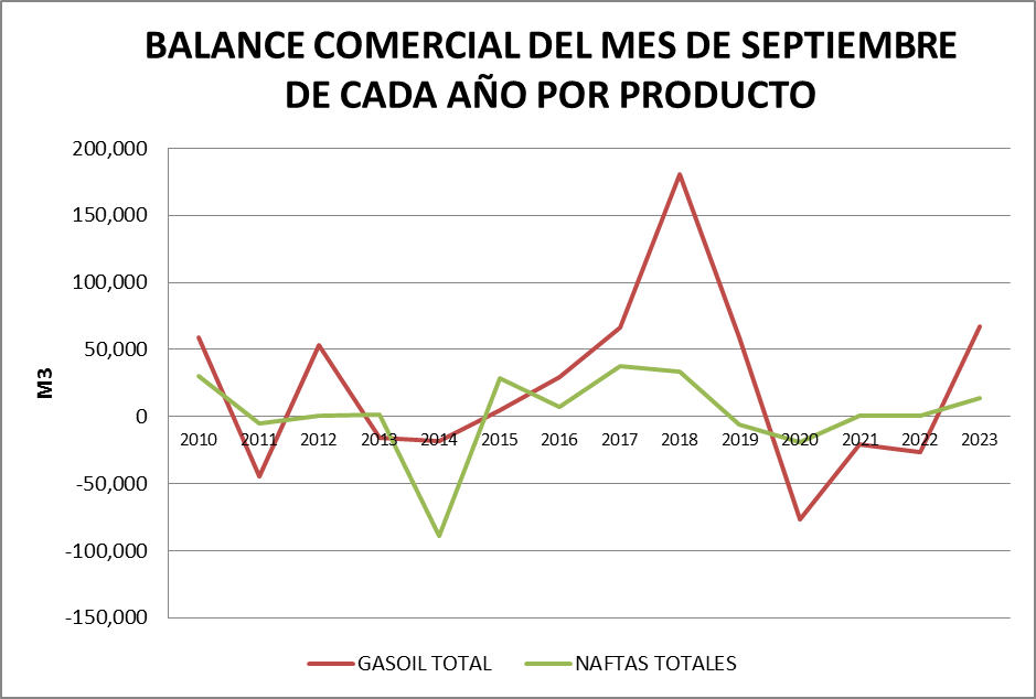Para el análisis que presentamos a continuación, que tiene como objetivo realizar un Balance Comercial, tomaremos los volúmenes de nafta grado 2, nafta grado 3, gasoil grado 2 y gasoil grado 3, correspondientes al mes de septiembre de cada año (último dato disponible).