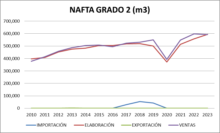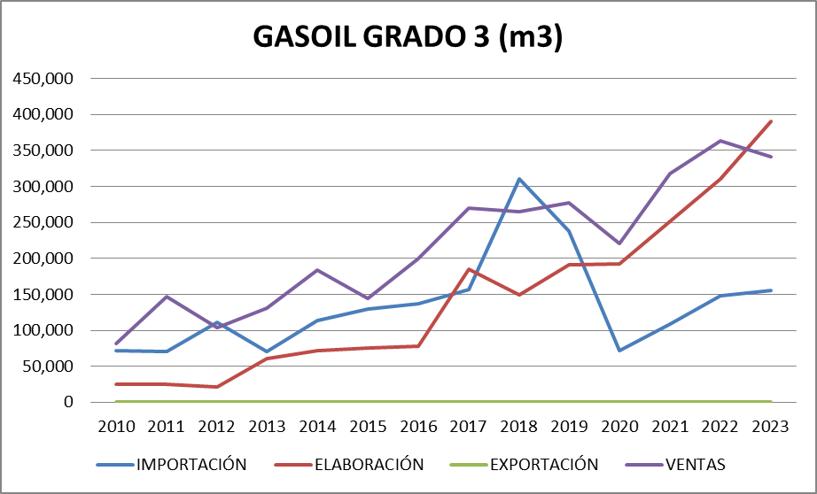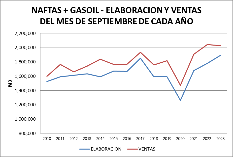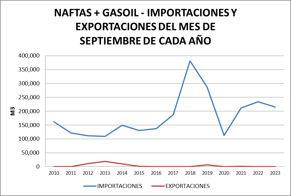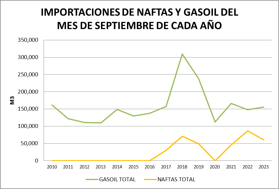 La importación de los cuatro productos representó en septiembre de 2023 el 10,6% del total vendido y se importó gasoil grado 3 y nafta grado 3. El 45,6% del gasoil grado 3 vendido provino de la importación mientras que el 26,35% de esta nafta vendida en el mercado interno fue importada.