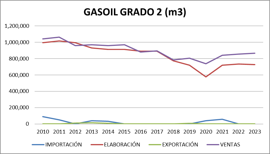 | AÑO | Gasoil Grado 2 (Común) | Gasoil Grado 3 (Ultra) | Nafta Grado 2 (Súper) | Nafta Grado 3 (Ultra) | TOTAL |