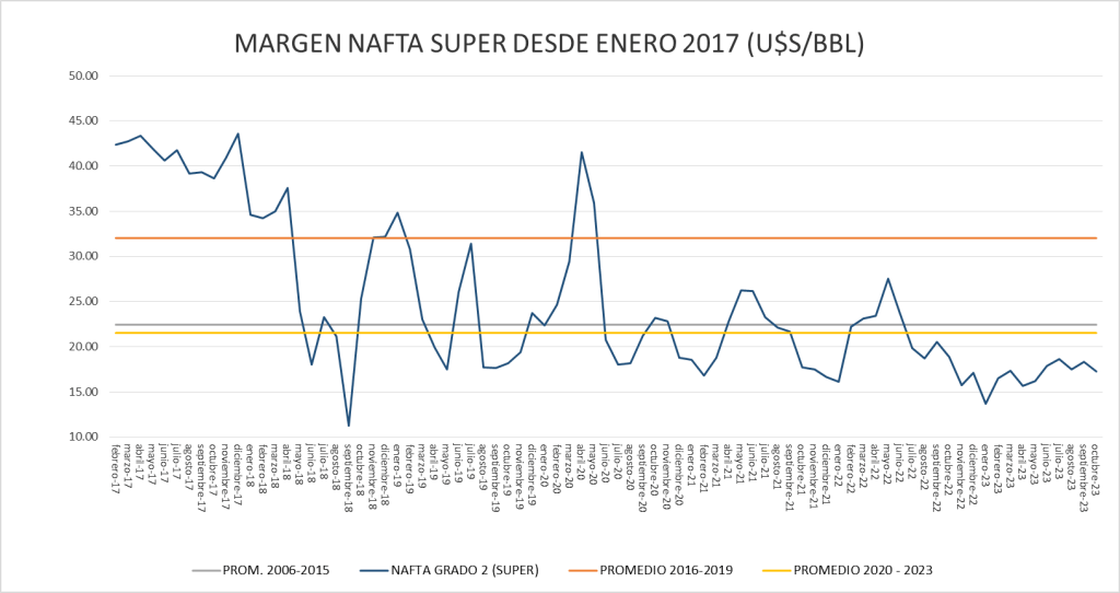 El margen bruto de nafta sigue por debajo del valor del promedio del período enero 2020 – octubre 2023.