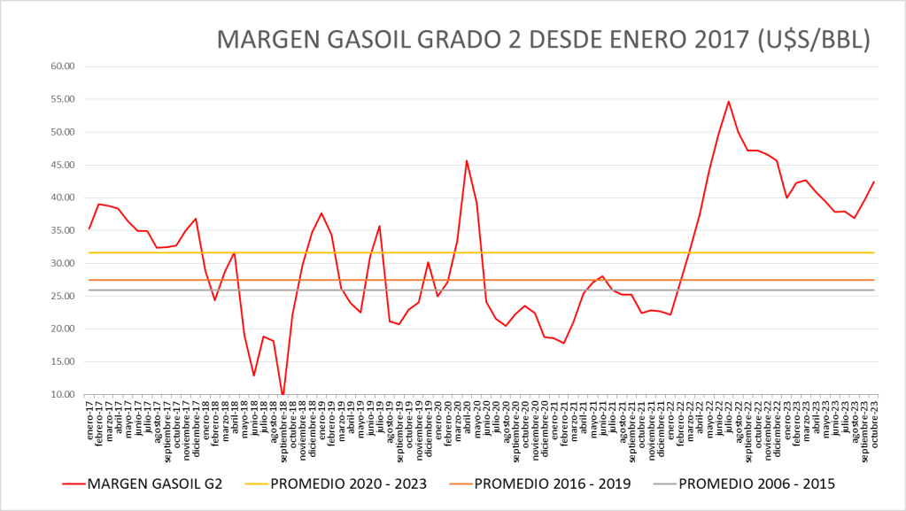 El Margen del gasoil grado 2 de octubre de 2023 (42,45 u$s/bbl) se sitúa por encima del promedio del período enero de 2016 a octubre de 2023 (31,05 u$s/bbl).