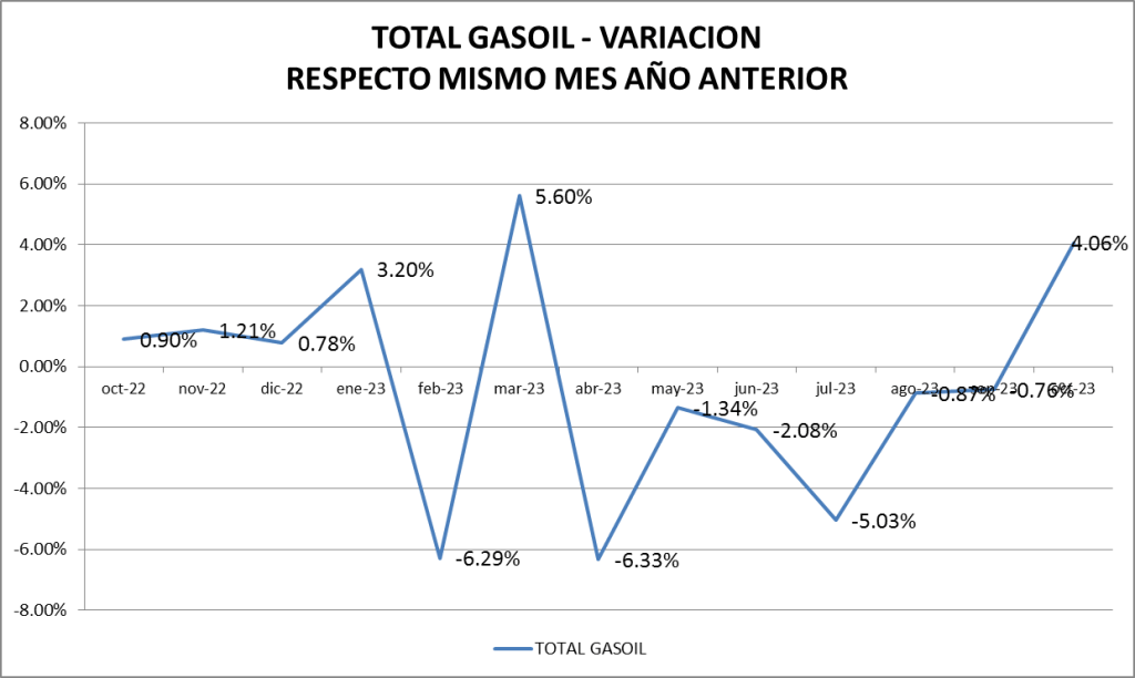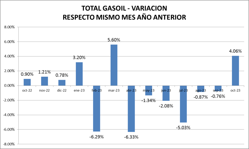 El gasoil total vende, en octubre de 2023, un 4,06% más que en el 2022.