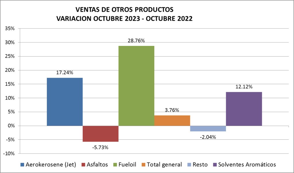 En octubre de 2023, las ventas totales de naftas subieron un 8,98 % respecto al mes anterior mientras que las de gasoil también subieron, pero un 3,68%.