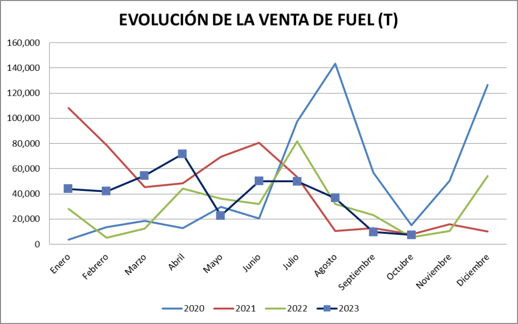 Las ventas de fuel oil registradas en octubre son 7.452 toneladas, cifra por encima de lo vendido en el año 2022 (5.787 t).