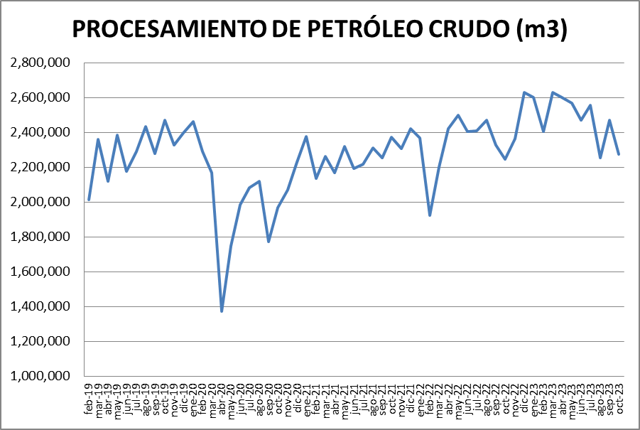 En octubre de 2023, el procesamiento de petróleo crudo subió un 1,37% respecto del mes anterior.