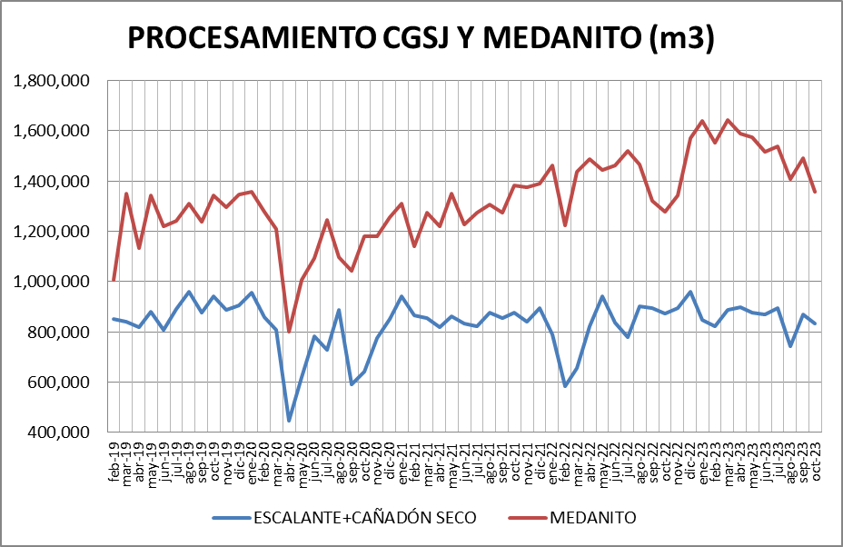 Escalante-Cañadón Seco: Se procesó, en octubre de 2023, un 3,9% menos que en septiembre de 2023 y un 4,5% también menos que en octubre de 2022.