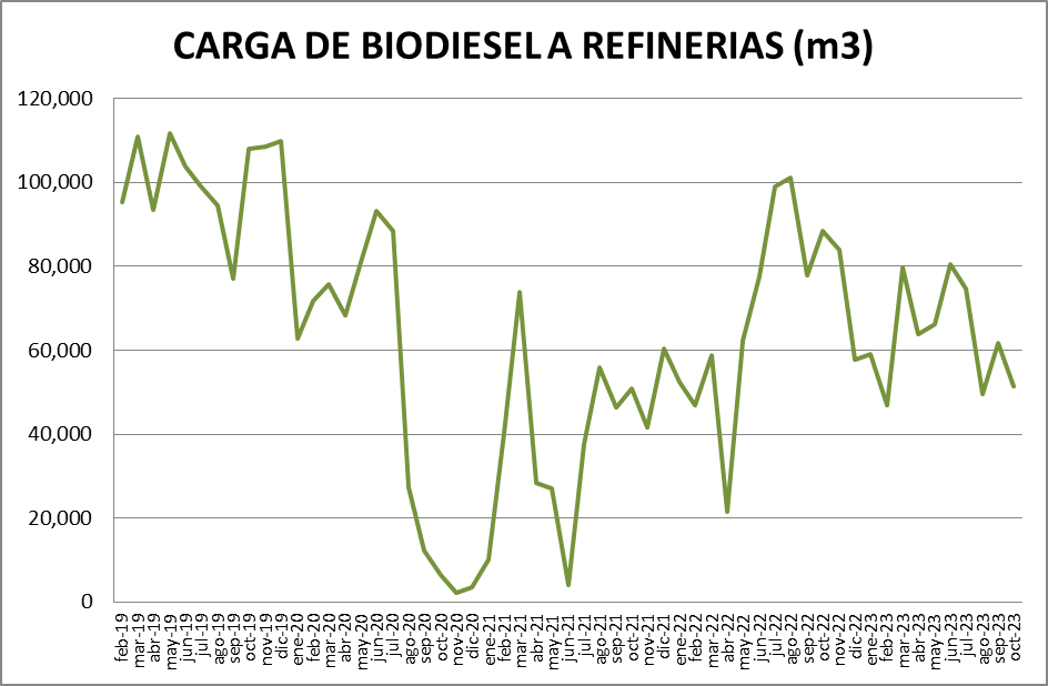 La carga de biodiesel en refinerías bajó, en octubre de 2023, un 16,6% respecto al mes anterior.
