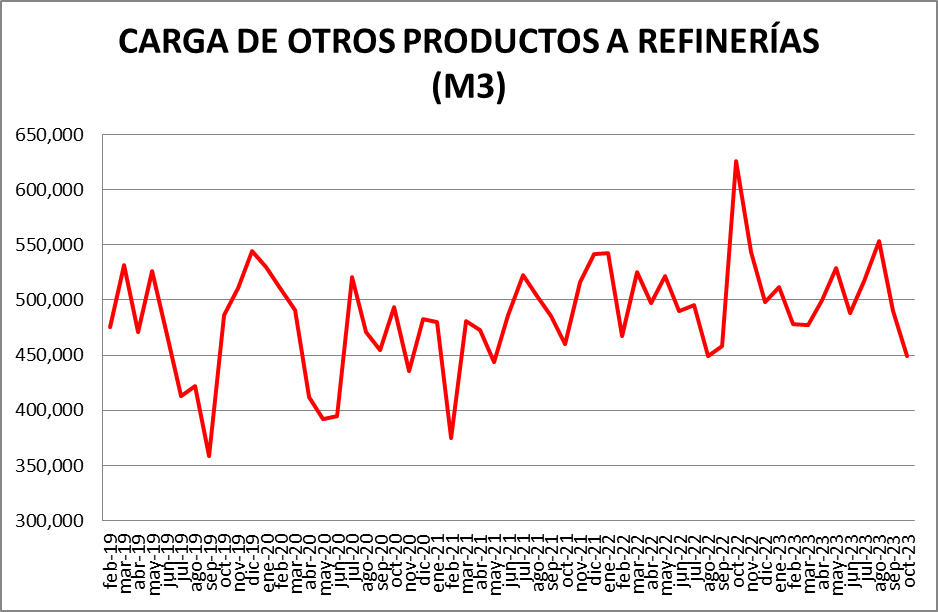 Dentro del rubro “Otras cargas” donde ” se encuentran: naftas sin terminar, mejoradores octánicos, cortes de gasoil, nafta virgen, cortes de kerosene, nafta reformada, destilado de vacío, etc., la evolución fue la siguiente: respecto a septiembre de 2023: -8,25%; respecto a octubre de 2022: -28,2%.