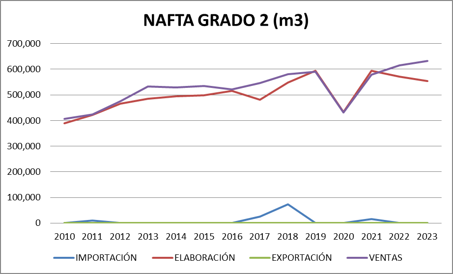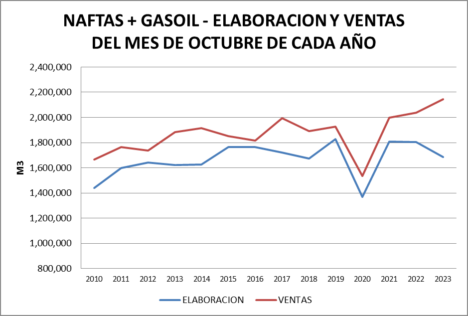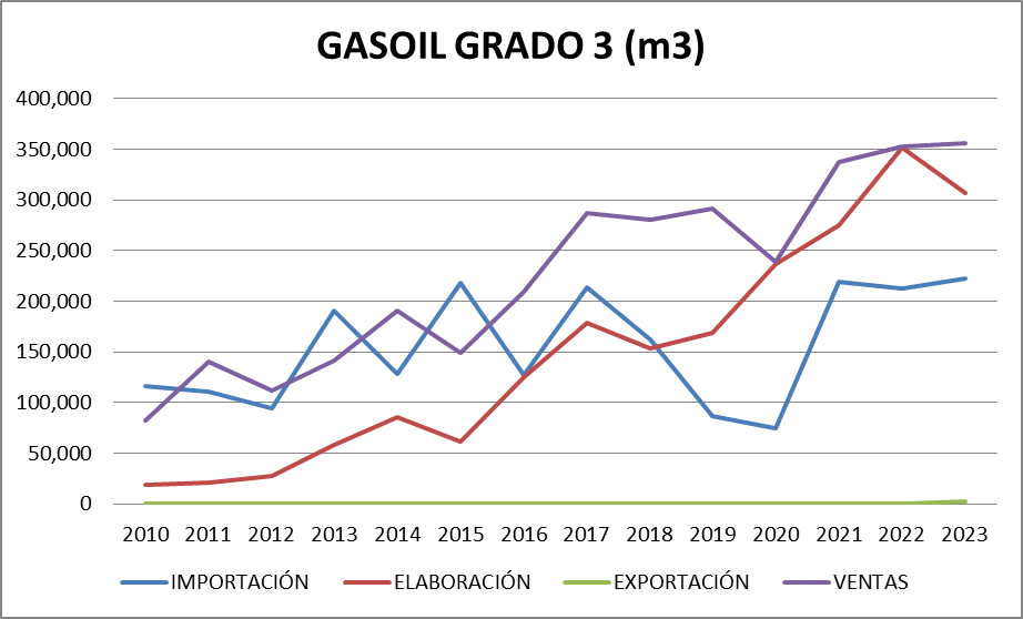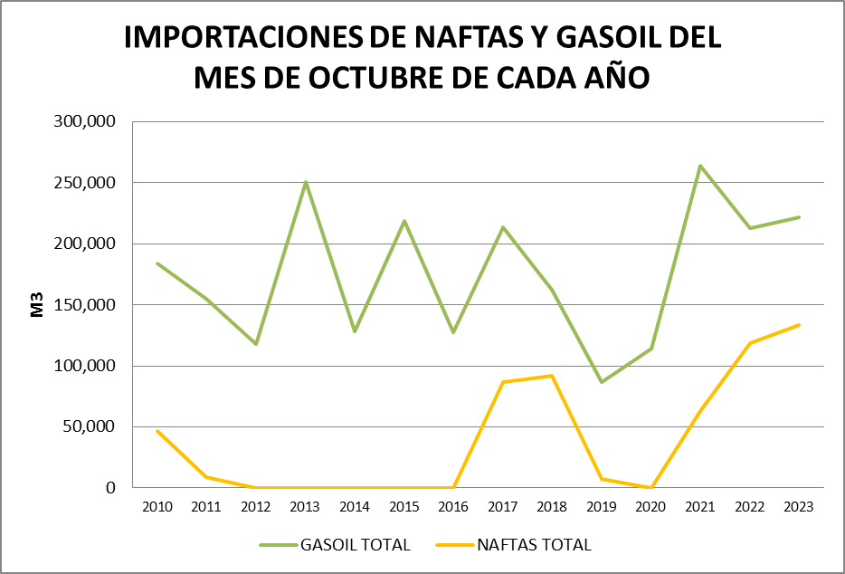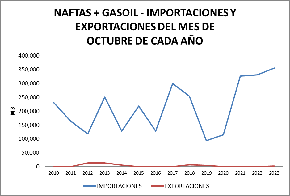 La importación de los cuatro productos representó en octubre de 2023 el 16,6% del total vendido y se importó gasoil grado 3 y nafta grado 3. El 62,4% del gasoil grado 3 vendido provino de la importación mientras que el 51,9% de la nafta vendida en el mercado interno fue importada.