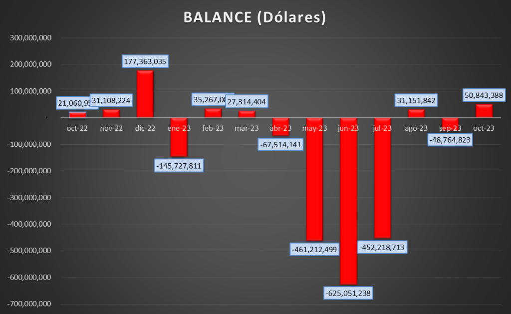 Las importaciones totales en octubre de 2023 fueron de 394,3 MMu$s y las exportaciones de 445,1 MMu$s, resultando un balance positivo de 50,8 MMu$s.