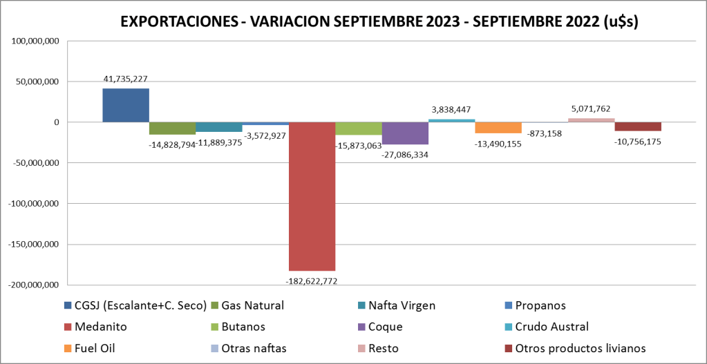 Se exportaron, además, 387.547 m3 de crudo Medanito con un valor de 85,85 u$s/bbl. Son 2.437.674 barriles que generaron un ingreso de 209,3 millones de dólares.