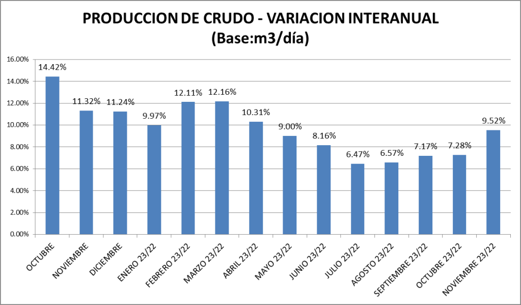 En el mes de noviembre de 2023, en petróleo crudo, se muestra un crecimiento interanual un poco superior al del mes anterior.