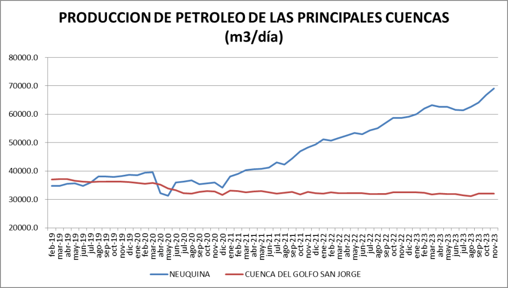La Cuenca Neuquina es la que más sigue creciendo interanualmente, apoyando su producción en Vaca Muerta (+17,61%, interanual). La segunda cuenca en importancia, la del Golfo San Jorge bajó un 1,39%.