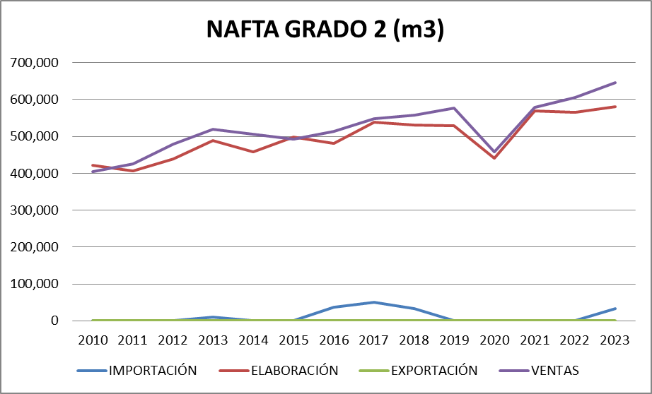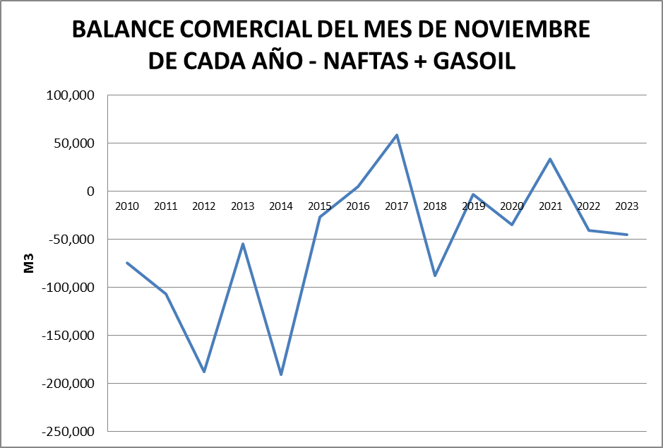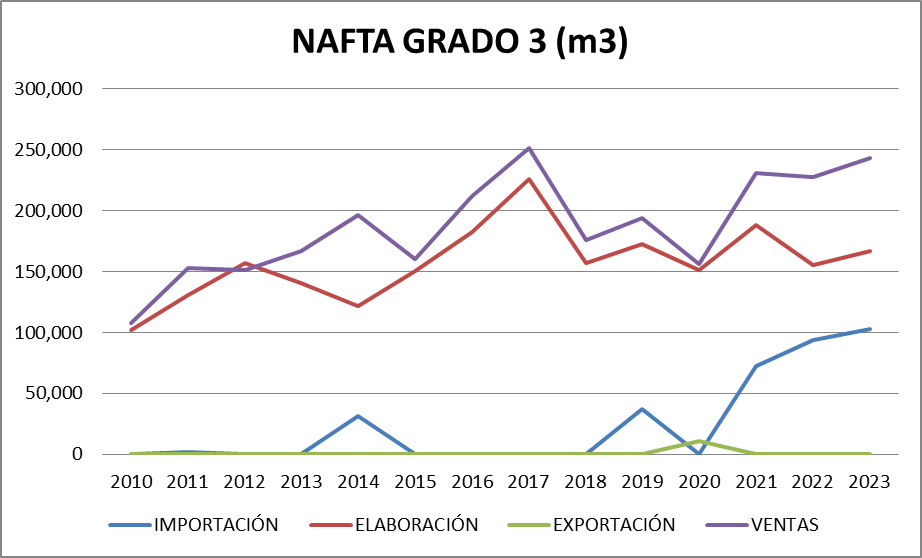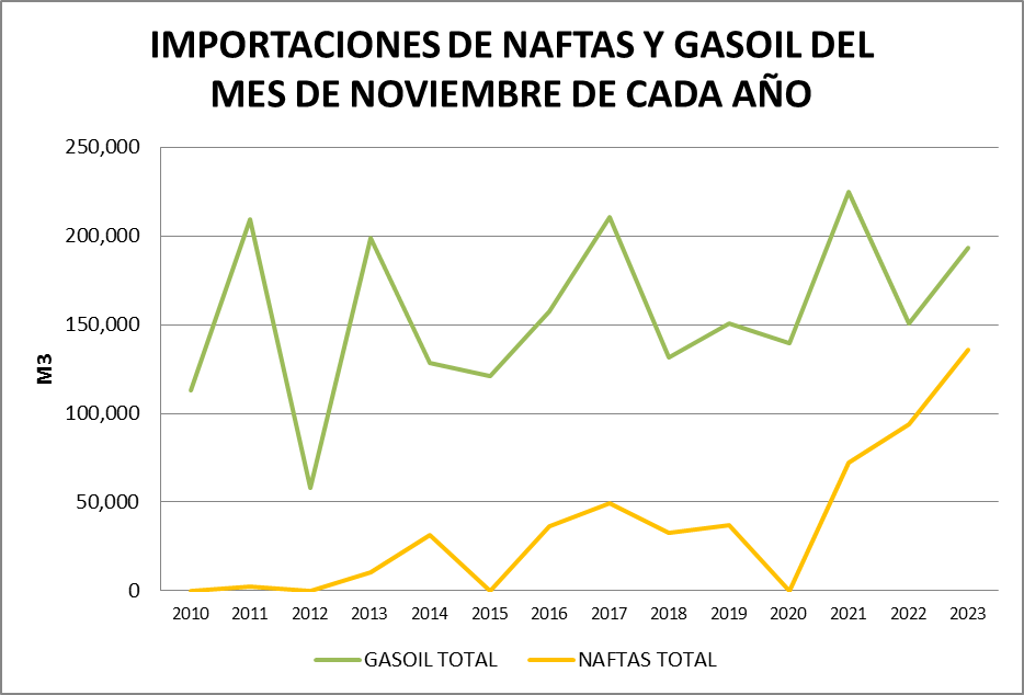 La importación de los cuatro productos representó en noviembre de 2023 el 15% del total vendido y se importó gasoil grado 3 y nafta grado 3. El 53,0% del gasoil grado 3 vendido provino de la importación mientras que el 42,2% de la nafta de mayor octanaje vendida en el mercado interno fue importada. De la nafta grado 2 (súper), el 5,2% de la venta fue importado.