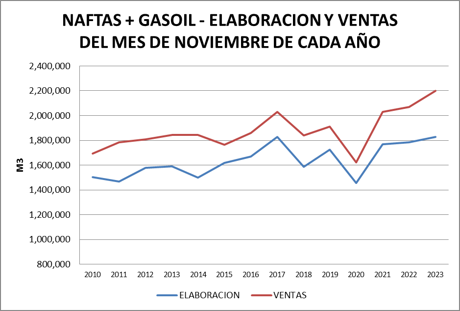 Puede verificarse gráficamente el crecimiento de las ventas (el mejor noviembre del período), mientras que la elaboración también fue importante.