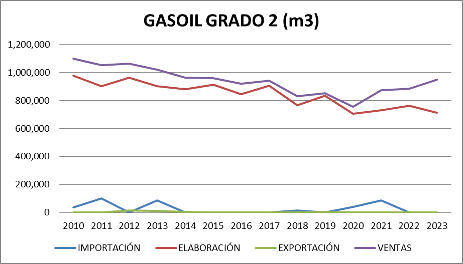 | AÑO | Gasoil Grado 2 (Común) | Gasoil Grado 3 (Ultra) | Nafta Grado 2 (Súper) | Nafta Grado 3 (Ultra) | TOTAL |