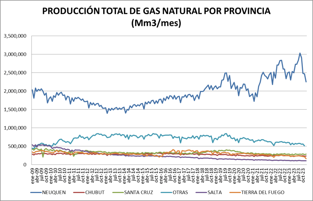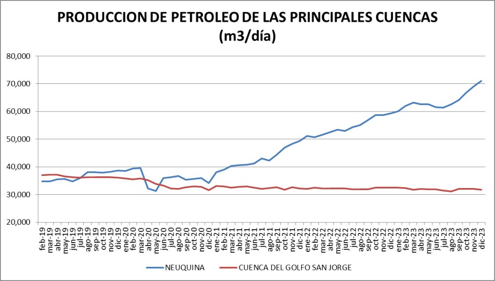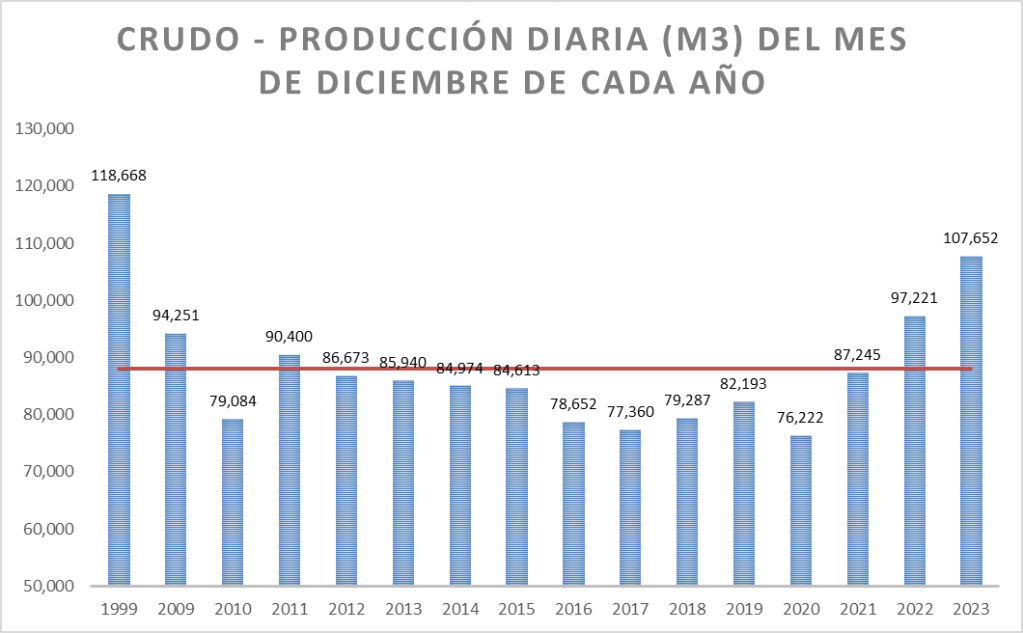 La producción diaria de diciembre de 2023 es superior al promedio de la serie (que incluye el valor de 1999 y es 88.152 m3/día).