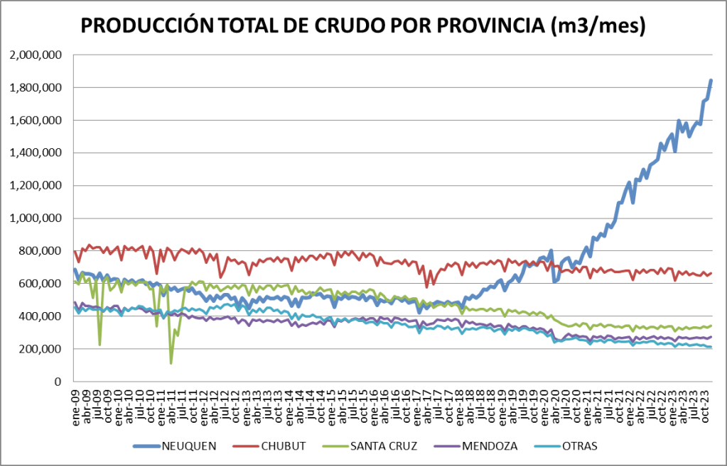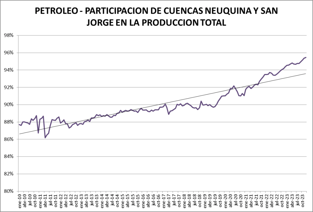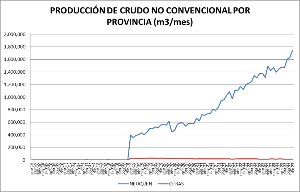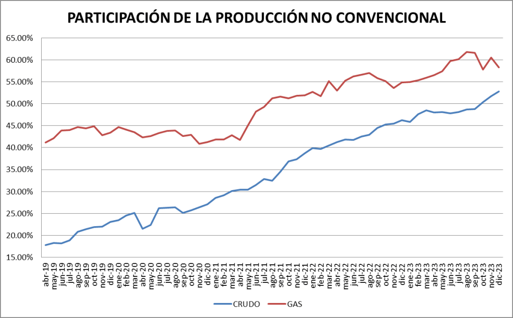 La participación del crudo no convencional en el total de la producción nacional fue, en diciembre de 2023, del 52,78%, constituyendo un nuevo récord.