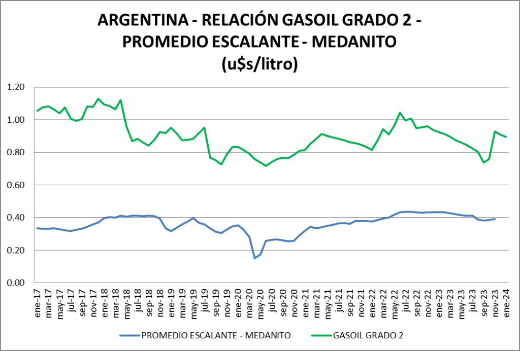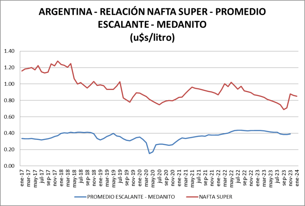Y un segundo período, donde el valor en dólares en Argentina cae desde el dólar por litro a cerca de 0,70 u$s/litro. Aquí, la regular supera a la súper local.