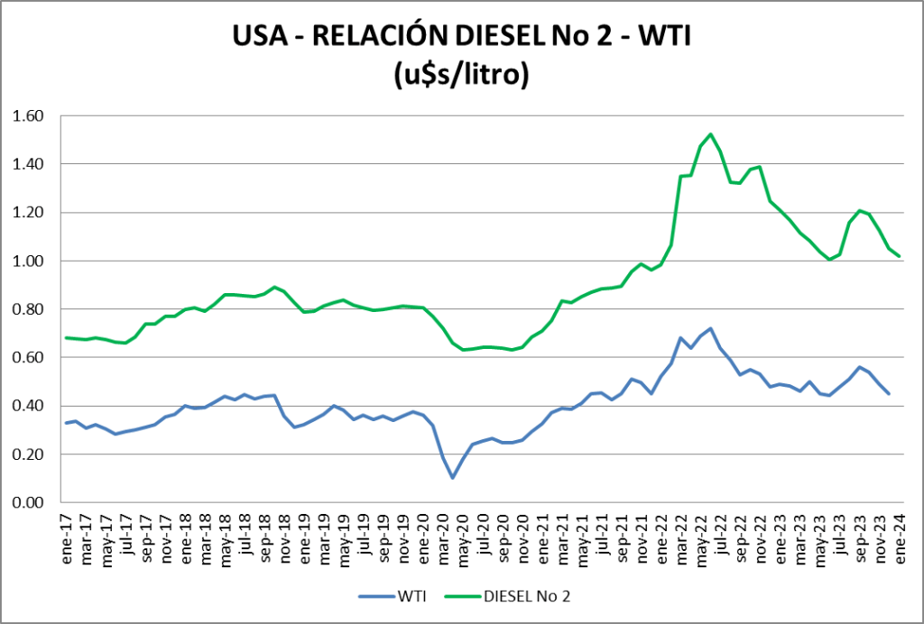 Para el gasoil en nuestro país, el de más alto contenido de azufre (gasoil grado 2) y la USA el No 2 Diesel Retail.