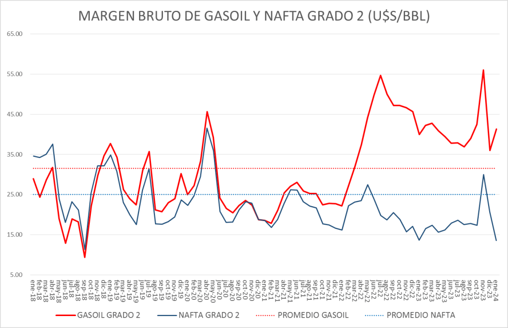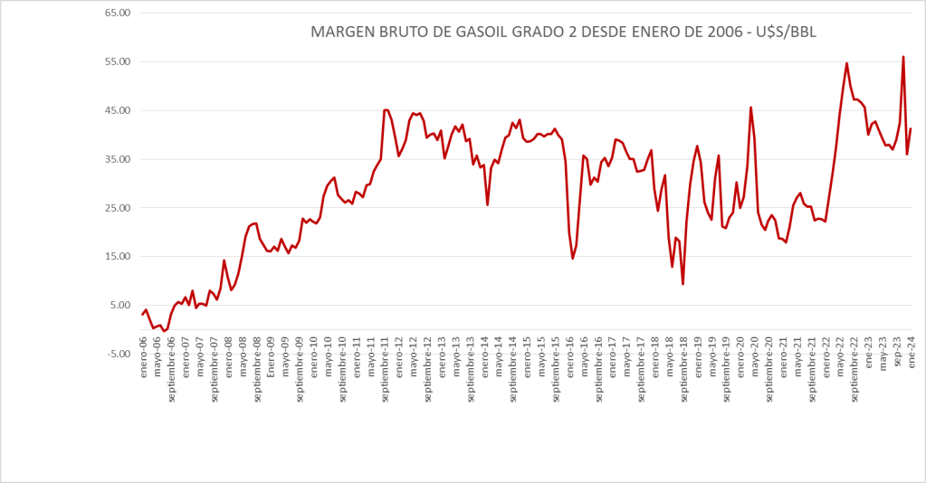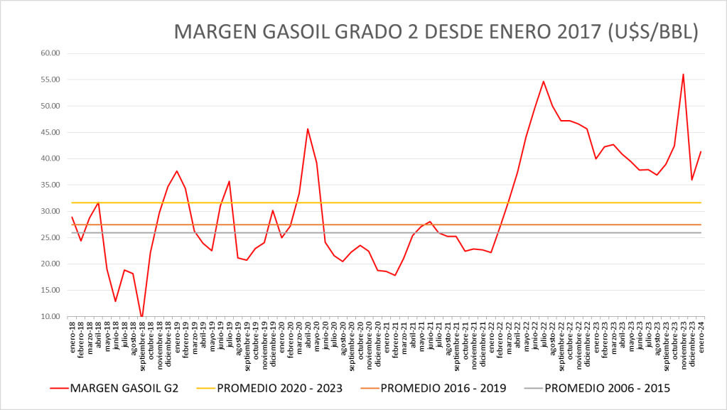 El Margen del gasoil grado 2 de enero de 2024 (41,29 u$s/bbl) se sitúa por encima del promedio del período enero de 2016 a enero de 2024 (31,52 u$s/bbl).