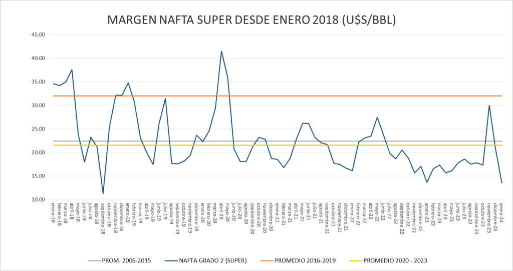 El de la nafta súper (13,54 u$s/bbl) se encuentra por debajo de su promedio (25,02 u$s/bbl).