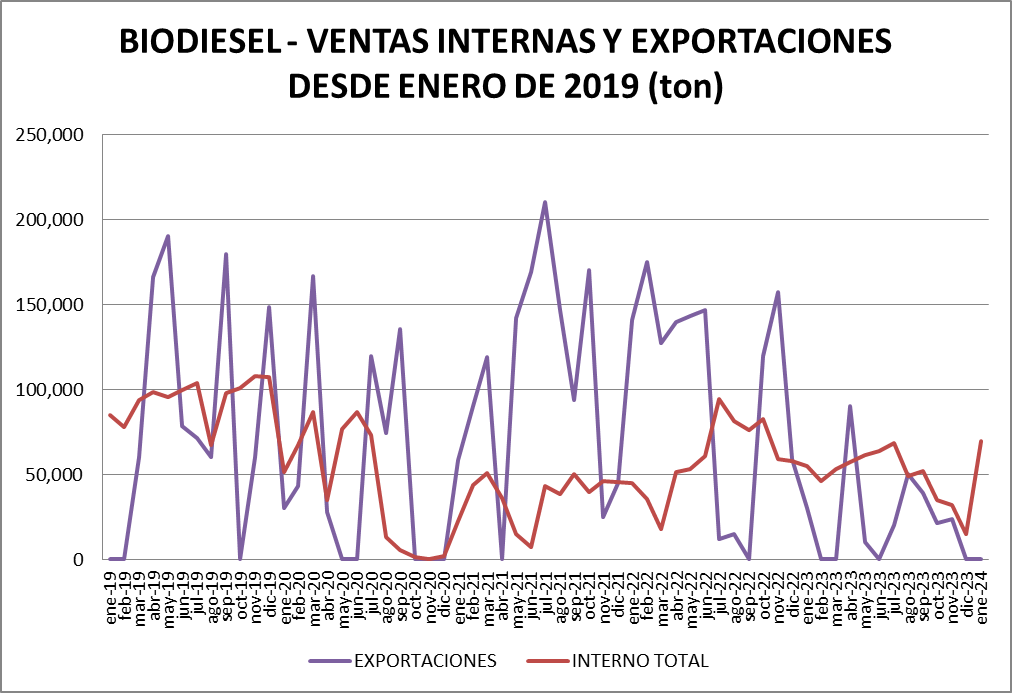 Para el biodiesel, la información parte desde enero de 2008 para las exportaciones y desde febrero de 2010 para la venta a refinerías.