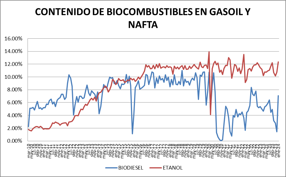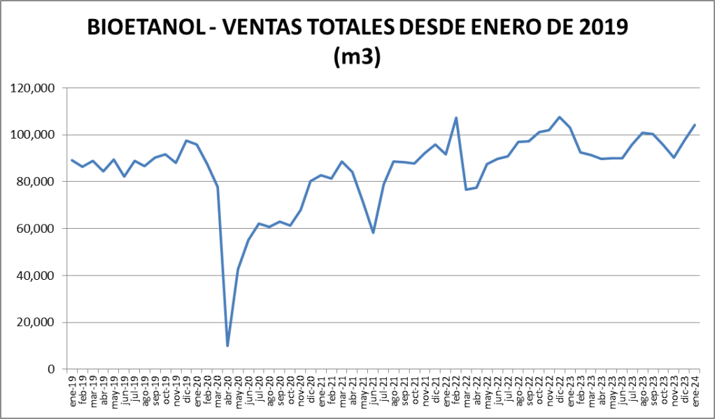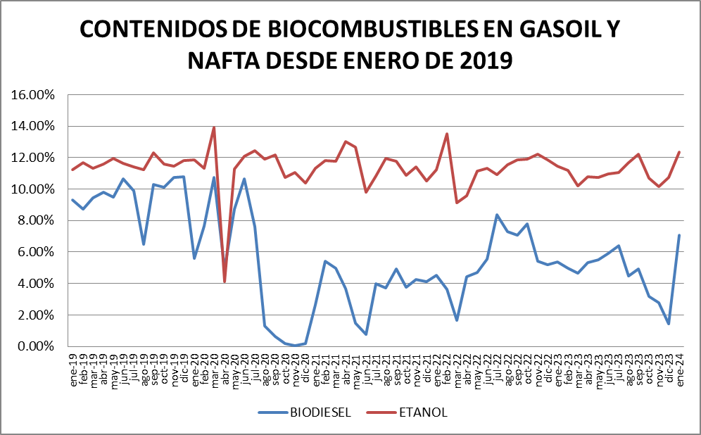 El contenido de bioetanol en naftas fue del 12,34% en enero de 2024, que es el sexto valor más alto desde el inicio de la actividad. El mayor número se había dado en marzo de 2020 con 13,91%.