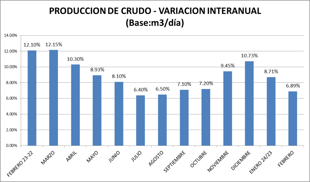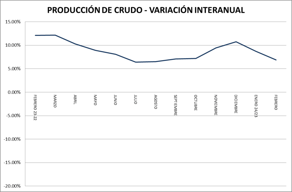 En el mes de febrero de 2024, en petróleo crudo, se muestra un crecimiento interanual menor al del mes anterior, situación que se repite.