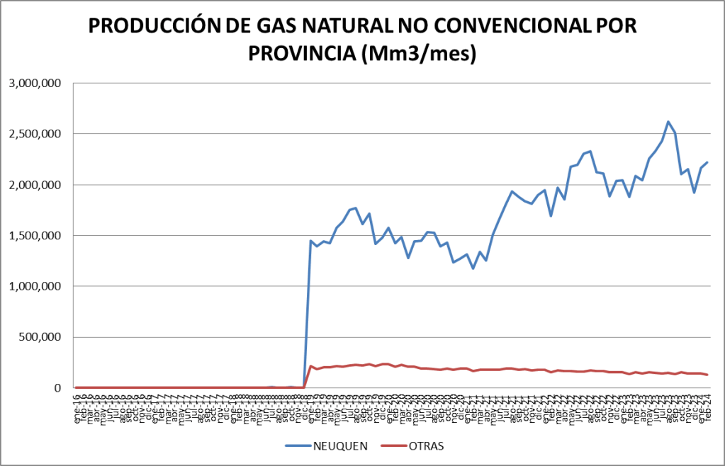 La participación de no convencionales en gas natural fue, en febrero, del 60,40%.