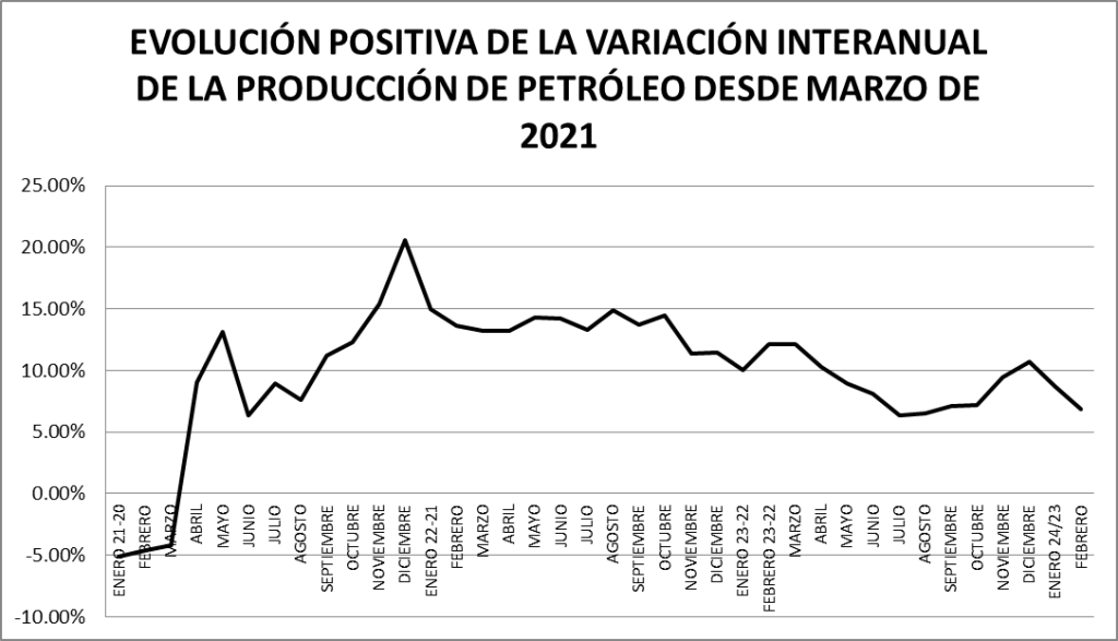 La producción diaria de petróleo crudo de febrero de 2024 fue la mayor de esos mismos meses desde el año 2009.