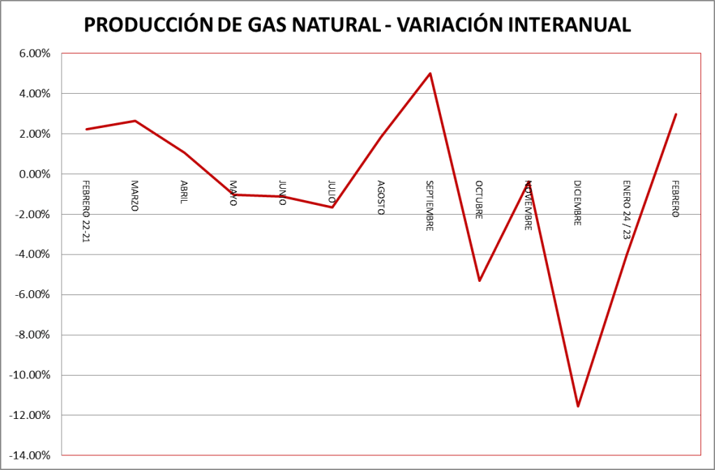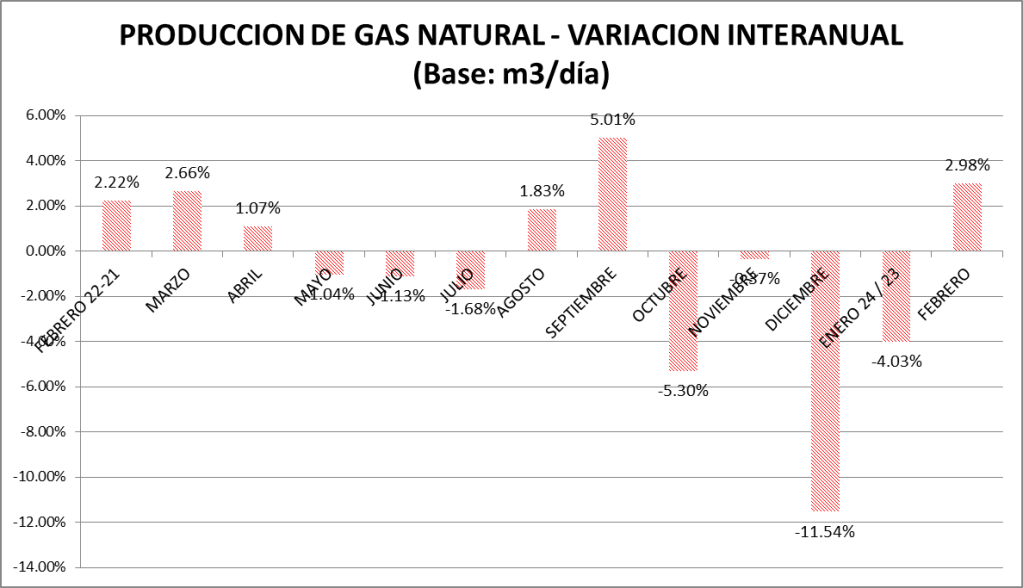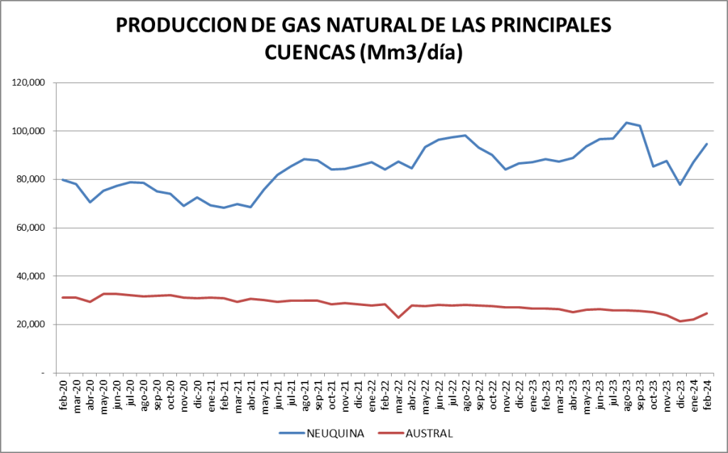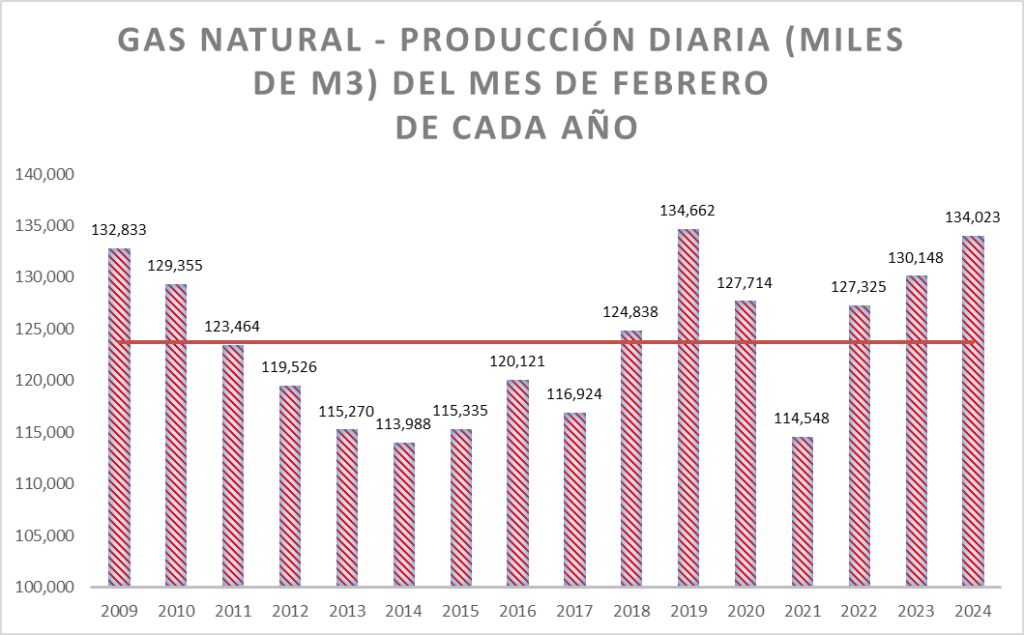 La producción diaria de febrero de 2024 es superior al promedio de la serie (que incluye el valor de 1999 y es 90.070 m3/día).
