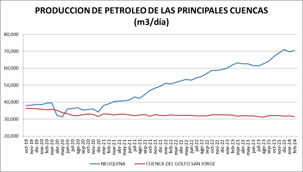 La Cuenca Neuquina es la que más sigue creciendo interanualmente, apoyando su producción en Vaca Muerta (+13,55%, interanual). La segunda cuenca en importancia, la del Golfo San Jorge bajó un 2,62%.
