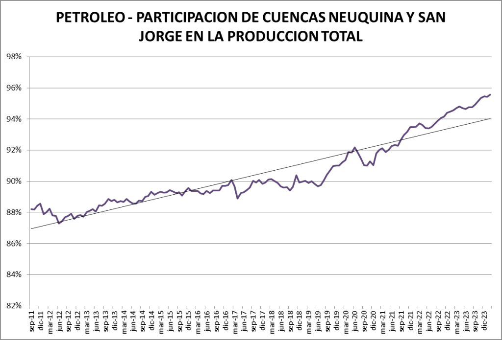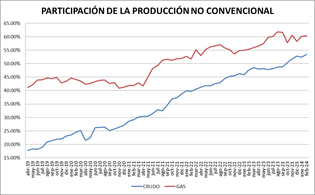 La participación del crudo no convencional en el total de la producción nacional fue, en enero de 2024, del 53,37%, lo que constituye un nuevo récord.