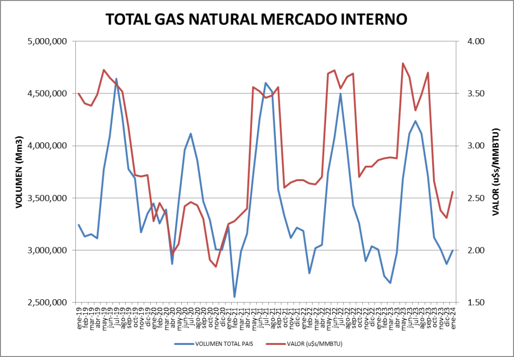 El volumen total comercializado en el mercado interno (103,414 MMm3/día) resulta, en enero de 2024, un 4,49% superior al mes anterior y un 0,27% menor que enero de 2023.