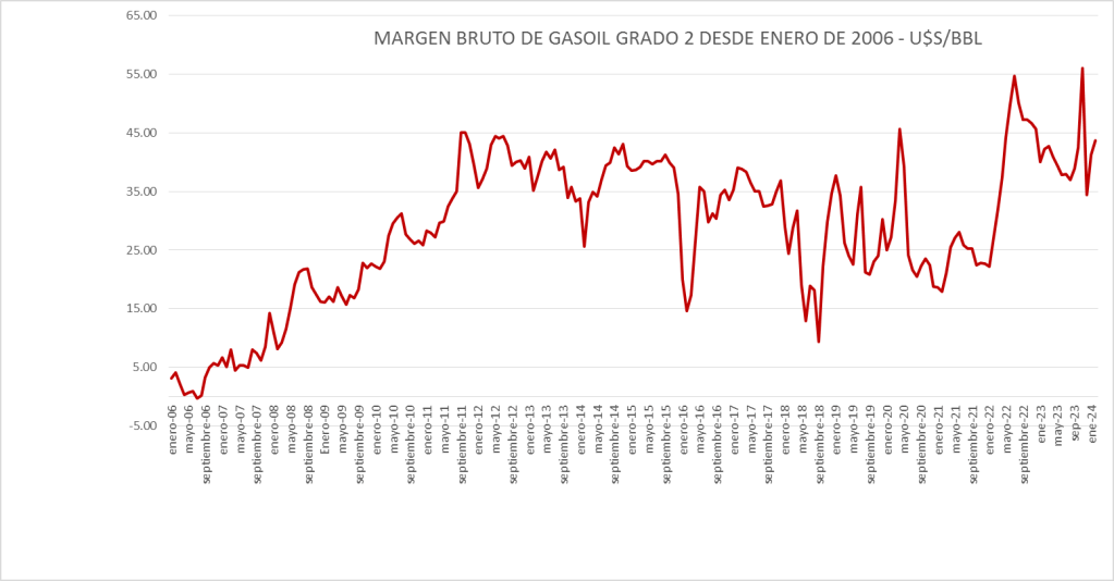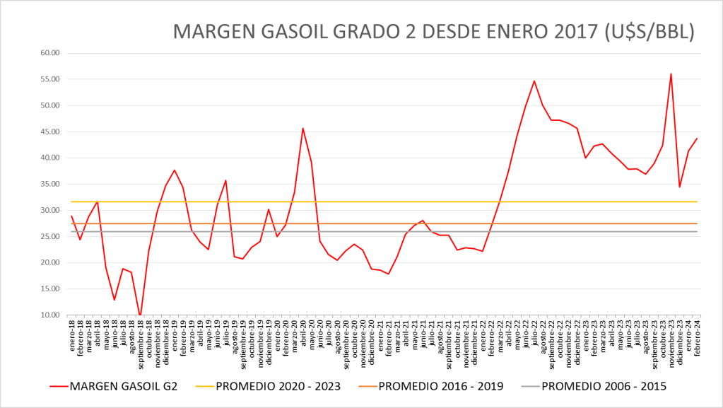 El Margen del gasoil grado 2 de febrero de 2024 (43,72 u$s/bbl) se sitúa por encima del promedio del período enero de 2016 a febrero de 2024 (31,65 u$s/bbl).