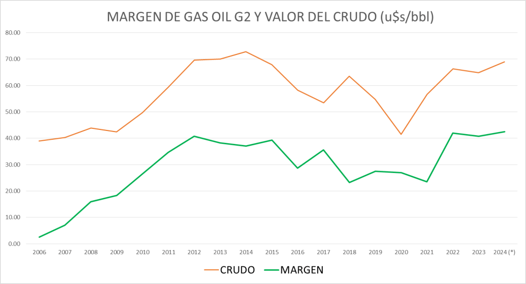 | Año | Valor producto (u$s/litro) | Margen (u$s/bbl) | Crudo promedio (u$s/bbl) |