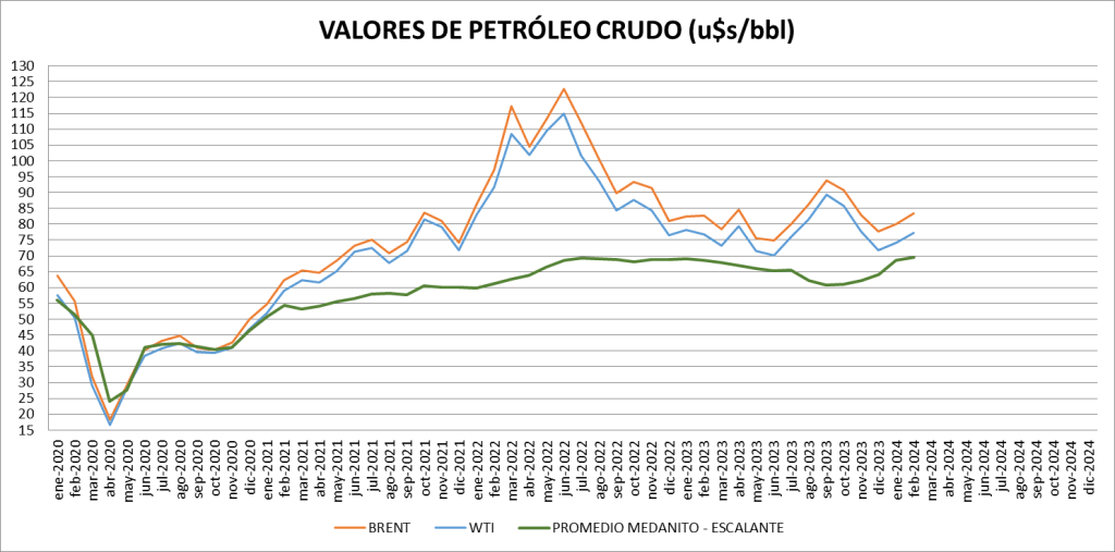 Se ralentizó en febrero de 2024 el aumento del precio local del crudo, que había iniciado en enero el camino a su paridad con el internacional. La brecha entre el promedio Escalante – Medanito y el crudo Brent aumentó al 20,11%.