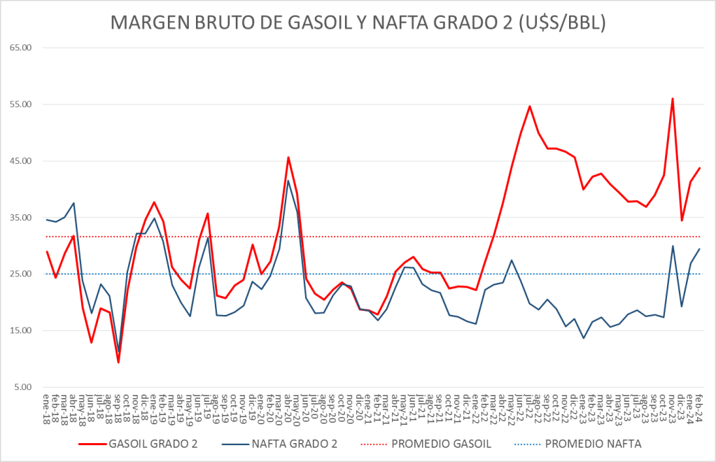 En febrero de 2024 el Margen Bruto de Refinación de la nafta súper sube un 9,47% y el del gasoil un 5,88%, ambos respecto al mes anterior.