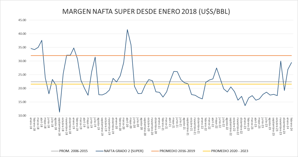 El de la nafta súper (29,47 u$s/bbl) se encuentra por arriba de su promedio (25,06 u$s/bbl).