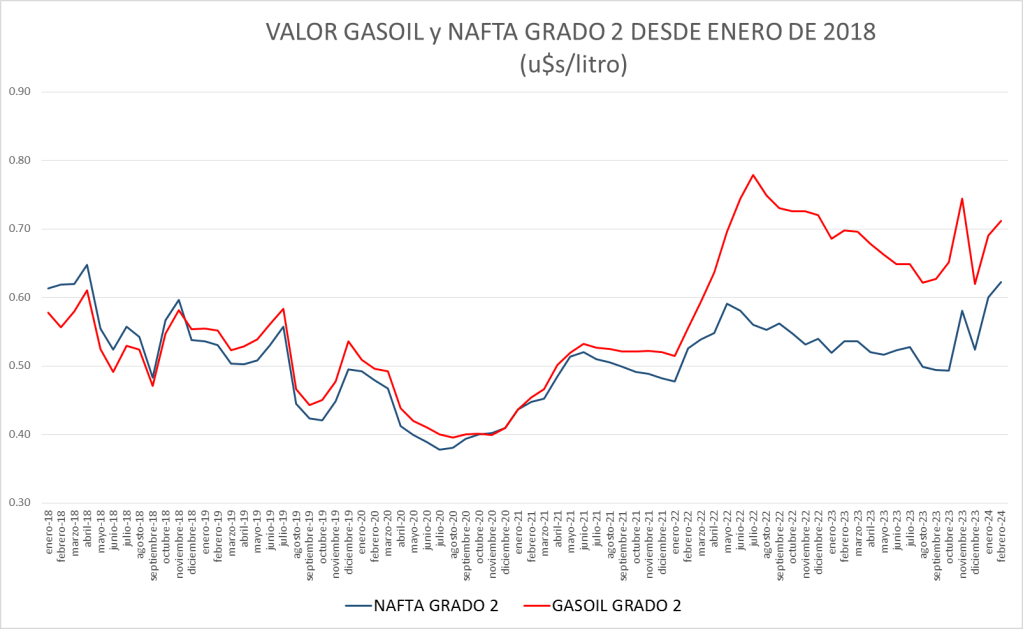 | En u$s/litro | NAFTA GRADO 2 | GASOIL GRADO 2 |