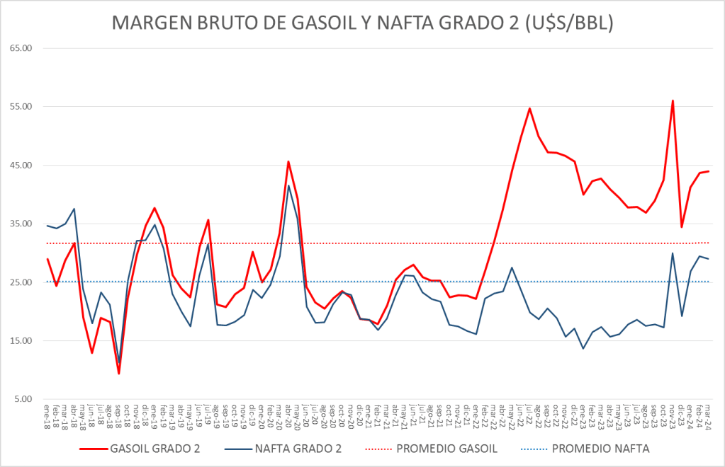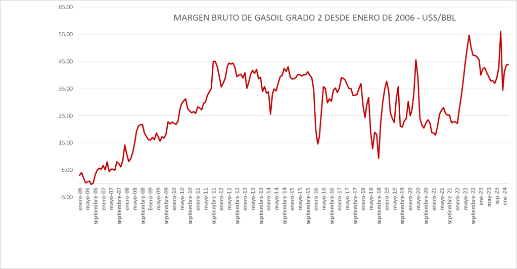 El Margen del gasoil grado 2 de marzo de 2024 (43,97 u$s/bbl) se sitúa por encima del promedio del período enero de 2016 a marzo de 2024 (31,64 u$s/bbl).