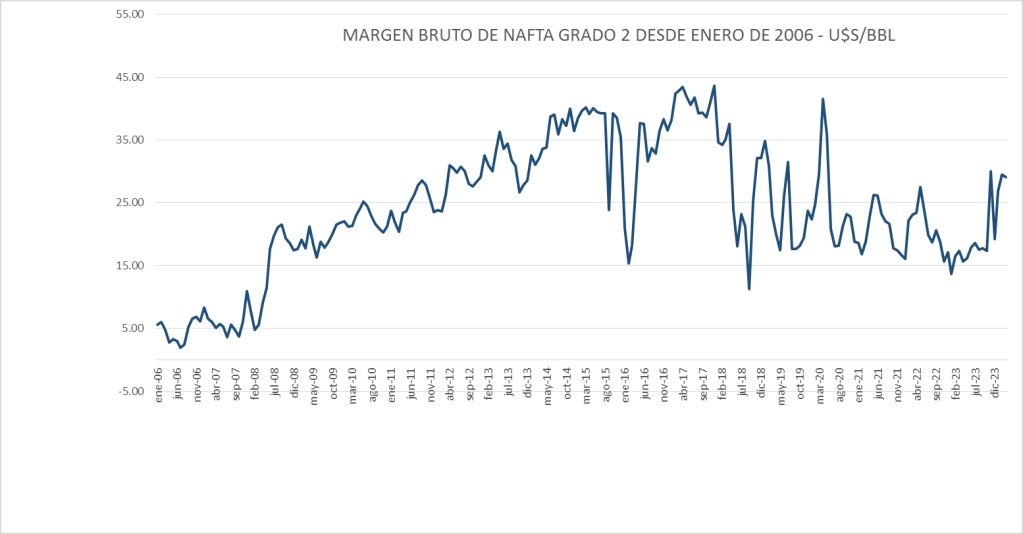 | Año | Valor producto (u$s/litro) | Margen (u$s/bbl) | Crudo promedio (u$s/bbl) |