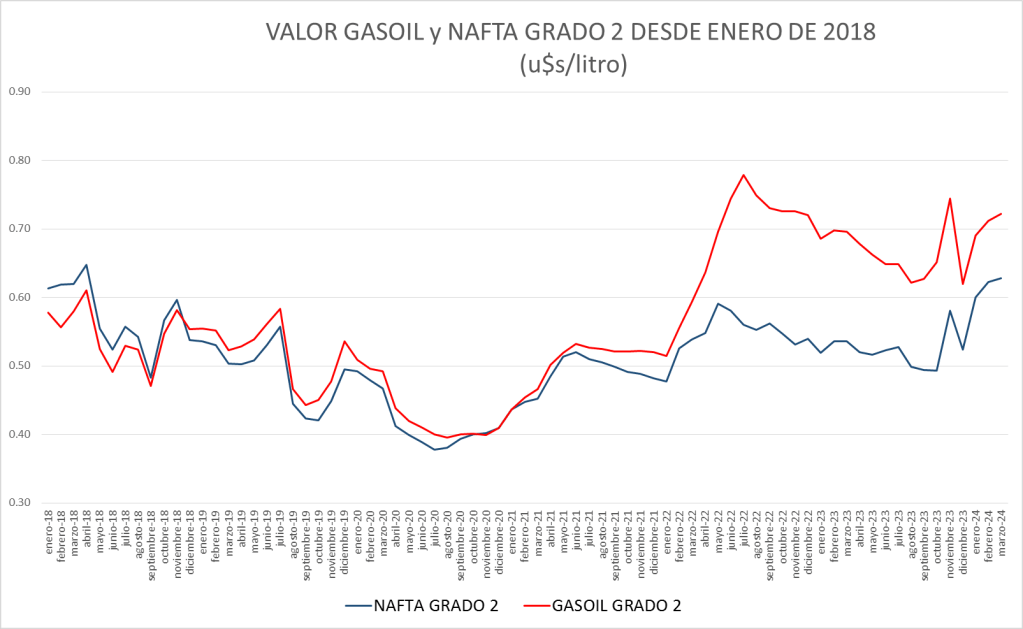 | En u$s/litro | NAFTA GRADO 2 | GASOIL GRADO 2 |