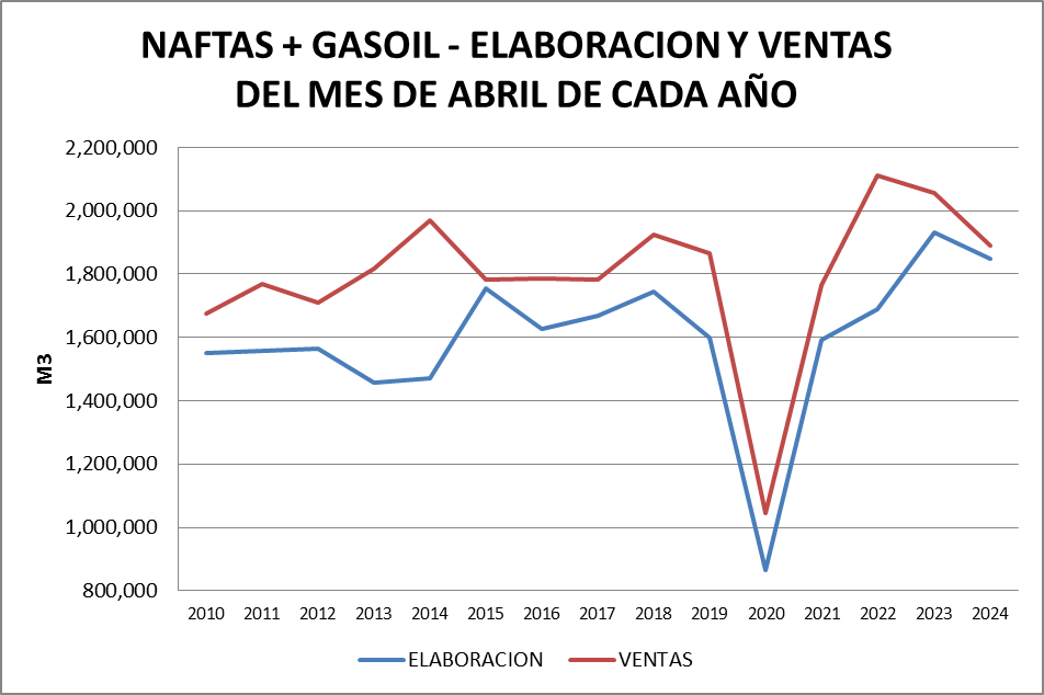 Veremos en los distintos cuadros que la elaboración doméstica fue un 4,3% inferior en abril de 2024 respecto al año anterior, mientras que la importación cayó un 67%, siempre considerando el conjunto de los cuatro productos. Las ventas fueron un 8,0% menores respecto a abril de 2023.