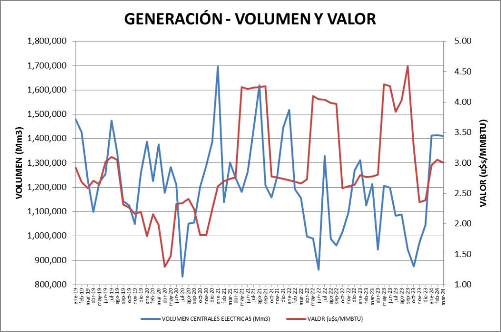 El precio del gas natural dirigido a la generación eléctrica, en marzo de 2024, bajó un 1,31% respecto a febrero y es un 8,27% mayor al de marzo de 2023.