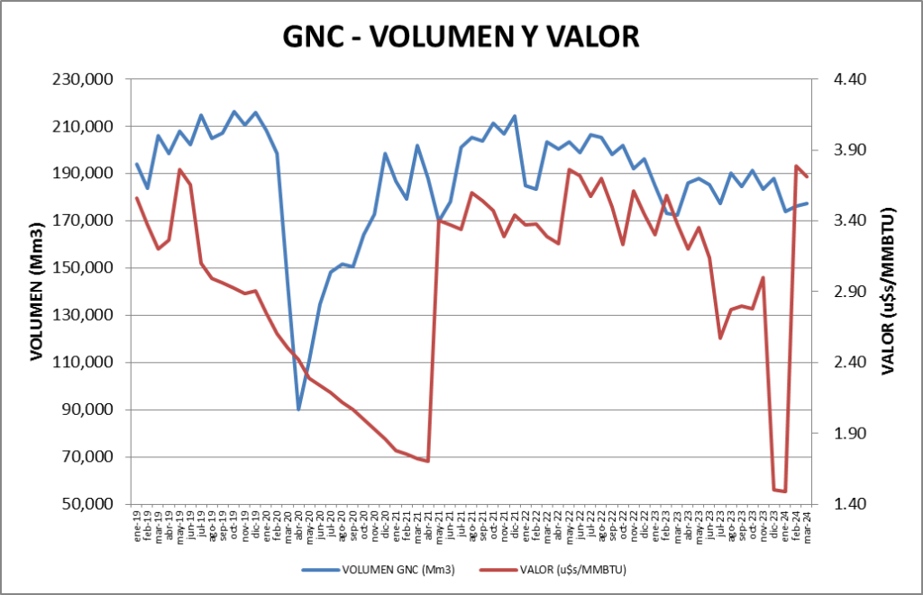 Se vendieron, en enero de 2024, 5,72 MMm3/día de Gas Natural Comprimido, valor un 0,65% por arriba del mes anterior y un 2,88% también mayor al de marzo de 2023.