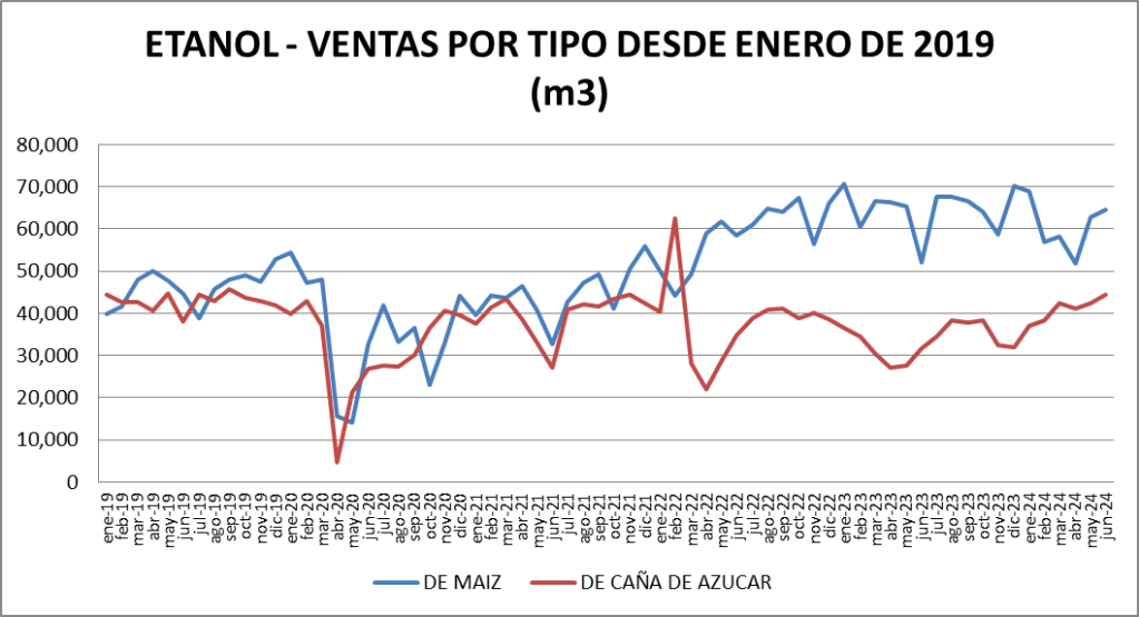 | Etanol de Maíz (m3) | 44,459 | -1.30% | -23.59% |