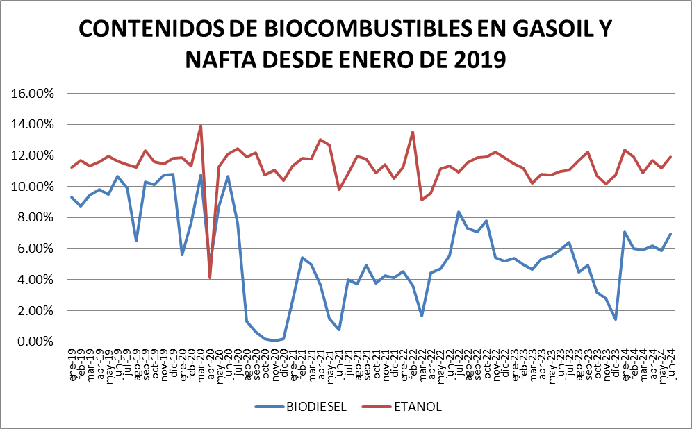 El contenido de bioetanol en naftas fue del 11,89% en junio de 2024 en el entorno normal de funcionamiento del sistema.