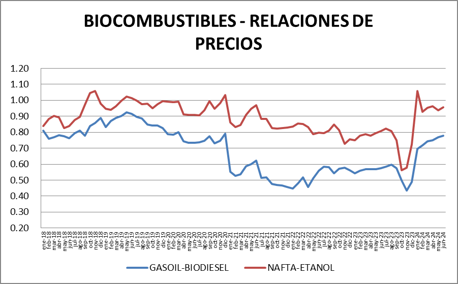 La relación de valores en nafta – etanol (0,96) aumentó respecto al mes anterior.